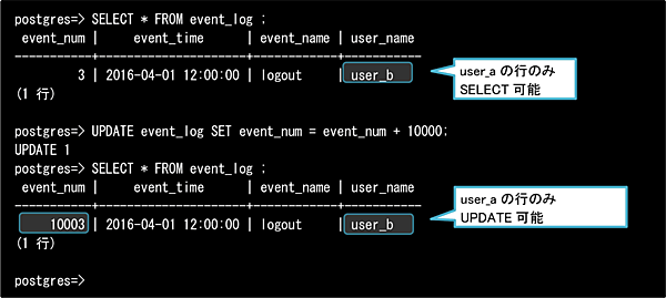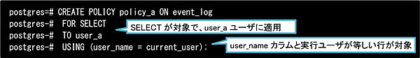 このUSING句では、user_nameカラムと現在の実行ユーザ(user_a)が等しい行を操作(SELECT)対象とします。この定義により、user_aユーザによる操作は以下のような結果になります。