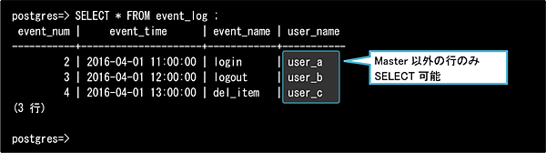 USING句を用いることで対象行を絞り込むことができます。今回はどの行に対しても真(true)となる条件なので、全行が操作対象になります。この定義により、masterユーザによる操作は以下のような結果になります。
