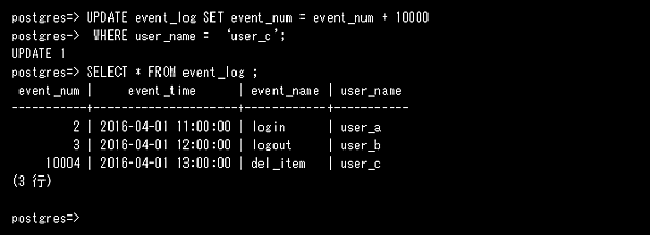 ※ユーザはあらかじめ作成済みとします。また、event_logテーブルは利用可能なすべての権限がすべてのユーザに与えられている状態とします。