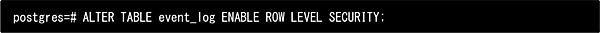 セキュリティポリシーの定義後、最後に以下のクエリを発行することで、対象テーブにおけるRLS機能を有効化できます。