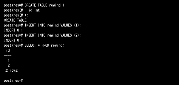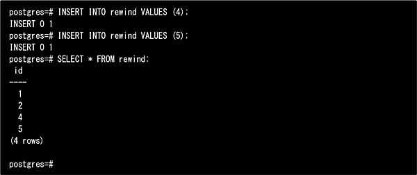 pg_rewind完了後、マスタを再起動することでフェイルバックが完了します。このとき、マスタ側の最終的なデータ内容は以下のようになっています。