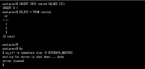 マスタに以下の値を挿入した後、スタンバイにデータが伝わる前にマスタが異常終了したと仮定します(今回は異常終了の代わりにimmediateモードでPostgreSQLを強制終了させています)。
