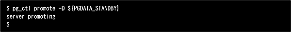 マスタが異常終了したため、スタンバイをマスタの代替システムとして稼動(フェイルオーバ)させます(今回は以下のコマンドでスタンバイを代替システムとして起動させています)。