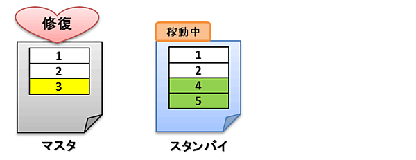 このまま稼動を続けると、いずれマスタは復旧しますが、以下の例のようにスタンバイには新しいデータが蓄積(または更新や削除)されていくことが予想されます。