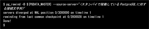 ※pg_rewindを使用する際、ターゲットとなるデータディレクトリ(マスタのデータディレクトリ)は正常にシャットダウンされている必要があります。今回は強制終了させたマスタのデータディレクトリを一度起動し、クラッシュリカバリ処理を完了させた後に再度停止させています。
