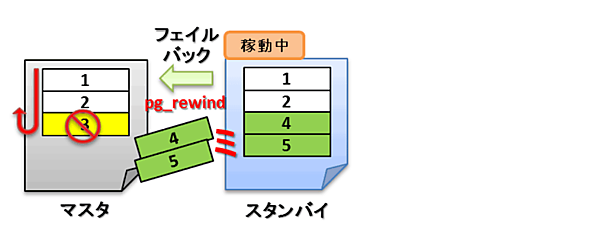 このとき、pg_rewindは以下の図のように元々マスタに挿入されていたデータ「3」を削除し(巻き戻し)、代替システム稼働時に挿入されたデータ「4」と「5」を追加(同期)します。