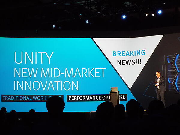 初日に発表された新製品はミッドレンジのストレージ、Unityだ。EMCには珍しくVもXも付かない製品名のUnityは従来のVNXをリプレースする製品となる。オールフラッシュのモデルとフラッシュ/HDDのハイブリッドモデルを用意した製品ラインで、オールフラッシュ元年を標榜するEMCにとっては価格重視の顧客に対するオファリングということだろう。