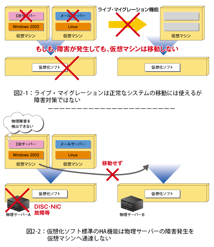 しかし、ライブ・マイグレーション機能は、正常なシステムの移動が前提となっている。移動は手動で行わなくてはならないという制約がある上に、ライブ・マイグレーションが動的にメモリをコピーしているため、物理サーバー上で起きた障害のイメージはすでに待機サーバー上にも波及してしまっているのだ。