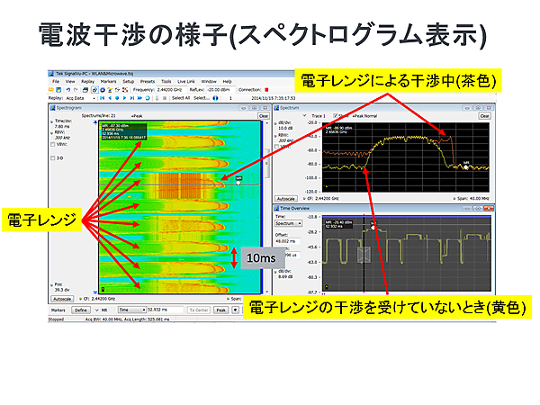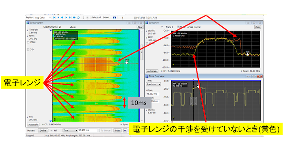 電波干渉の様子をスペクトログラムという、周波数vs時間の表示で見てみました。電子レンジから漏れる電磁波は他の通信のあるなしに関わらず10ms毎に出力されていることがわかります。無線LANの信号送信中に電子レンジからの電波が干渉している様子がわかります。