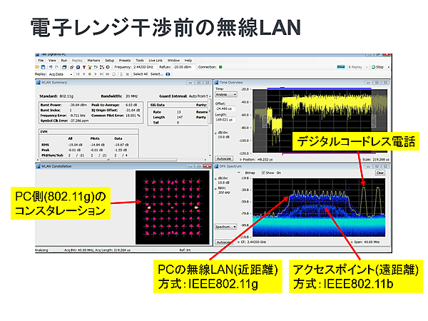 ここで、右下は周波数vsレベルのスペクトラム表示です。左下はコンスタレーション表示という信号品質を表す表示です。点の大きさが小さいほど送信品質が高いとお考えください。PC→アクセスポイントの信号、アクセスポイント→PCの信号、デジタルコードレス電話の信号が同じ周波数を使っていますが、お互いに干渉しないように制御されています。