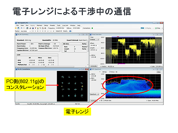 電子レンジのスイッチを入れたところの表示です。電子レンジから漏れる電磁波が無線LANに干渉している様子がわかります。左下のコンスタレーション表示の点の大きさが先ほどよりも大きくなっていることから、送信品質に影響が出ていることがわかります。