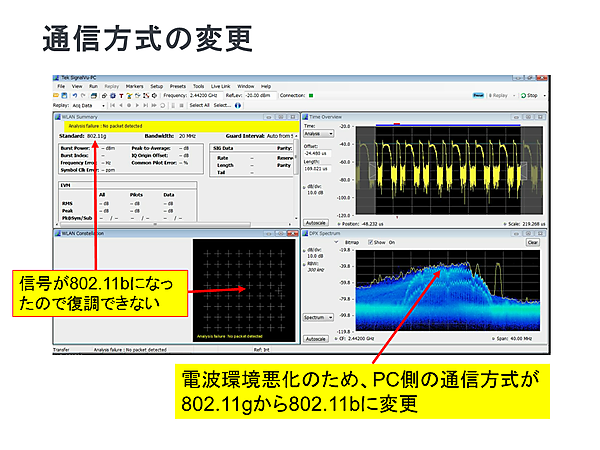 電波環境が悪化したため、無線LANの通信方式がIEEE802.11gからIEEE802.11bに変更されました。11bは11gよりも通信速度は遅いものの干渉には強くなっています。このように無線LANモジュールは電波環境に応じて自動的に電波干渉に強い通信方式(電速度は遅い)に変更して通信を継続しようとします。