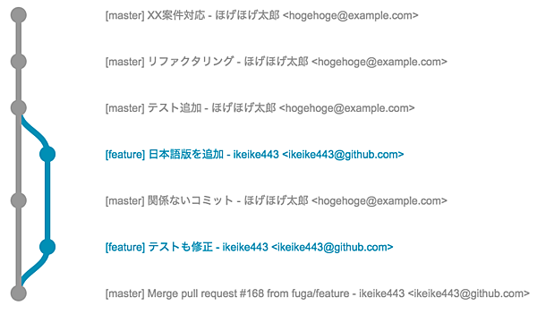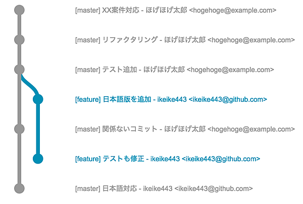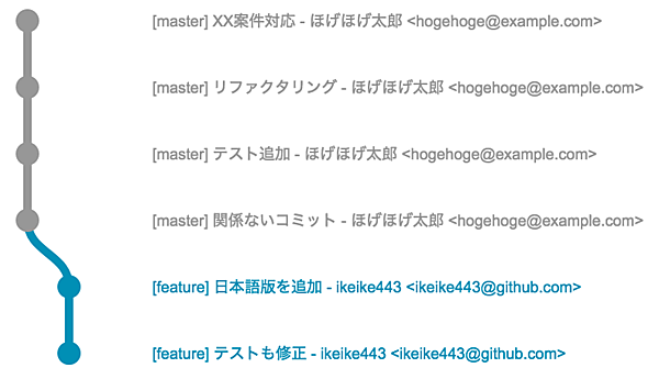 この例では、ikeike443という開発者がmasterブランチからfeatureブランチを作り、それに対して2つのコミットを追加しています。"日本語版を追加"と"テストも修正"の2つです。