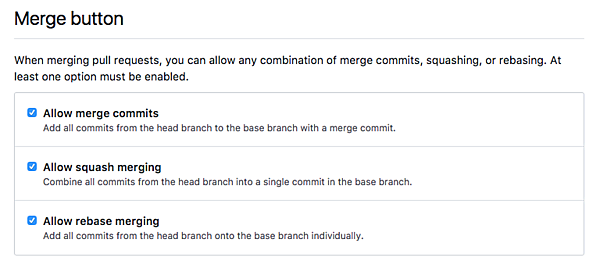 GitHub.comもGitHub Enterpriseも、現在はPull Requestのマージ時に3つのマージオプションが選べるようになっています。