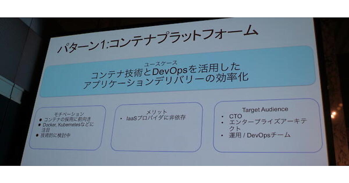 3つめのパターンは、プラットフォームに着目した「ハイブリッドクラウドを利用したい」だ。訴求対象はインフラチームなど。開発チーム向けにIaaS・PaaSを用意するという場面だ。パブリッククラウドと(OpenShiftによる)ハイブリッドクラウドを比較し、パブリッククラウドではそのサービスに依存してしまうことなどを挙げて、「OpenShiftによって、パブリッククラウドでもオンプレミスでもシームレスに使える」と大溝氏は主張した。