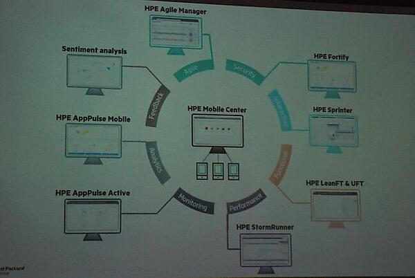 こうした課題を踏まえてHPEでは、アプリの設計・構築から開発、本番稼働、運用まで、パフォーマンスをモニタリングして最適化、ユーザー体験を担保している。ライフサイクル全体の視点で管理運用する際にハブとなるのが、同社が提供してるHPE Mobile Centerという様々なシステムを統括するツールだ。アナリティクスのAppPulse Mobile、Network Virtualization、セキュリティのSecurity Fortify、手動テストのSprinter、機能テストのUFTやLeanFT、パフォーマンステストのLoadrunnerとStormRunner、モニタリングのAppPulse Active、フィードバックを受け付けるAppPulse.ioなど全方位でサポートしている。