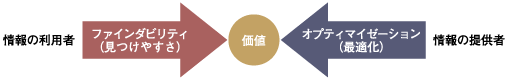 情報が肥大化・多様化する状況の中で適合性という課題を解決するには、「ファインダビリティ(見つけやすさ)」と「オプティマイザーション(最適化)」が重要となる。 ファインダビリティは利用者自らが能動的に情報を見つけることを助け(プル型)、オプティマイゼーションは情報の提供側がその情報を欲している利用者に適切にデリバリすることを助ける(プッシュ型)。個々人で異なる適合性を高めるためには、この両者がうまくかみあう必要があると考えている。 |