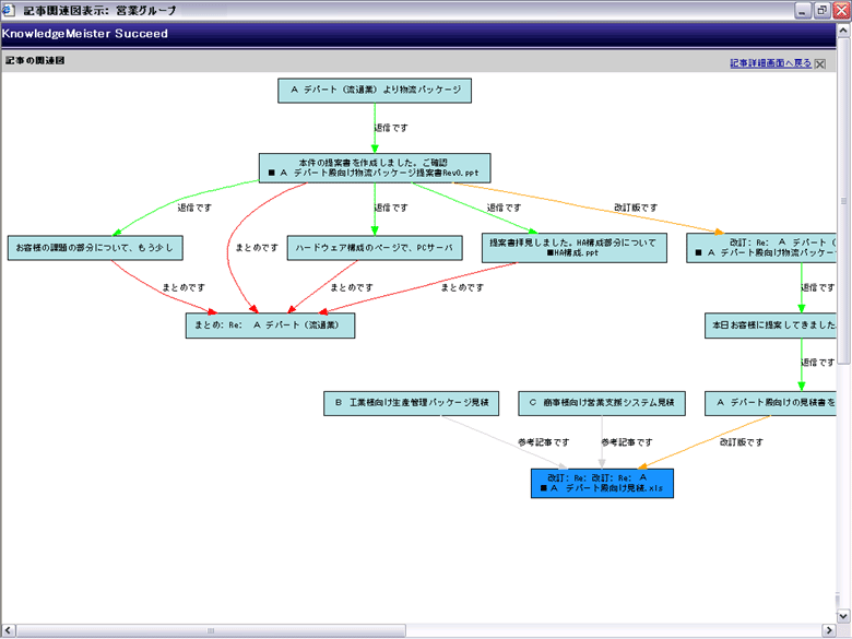 これらの情報は知識として活用しやすいように、業務プロセスおよび登録された情報同士の関連を持ち蓄積されていく(図3)。 これはインターネットや社内ファイルサーバで参照した情報なども関連付けることができるため、「どの業務の場面で」「どの情報を参考にして」「どんなコメントを反映したのか」などが関連性を持った情報として蓄積されていくのだ。 またこれらの情報を知識として吸収しやすいよう情報同士の関連を図式化したり、ツリー表示したりすることができる。このような可視化によって他のメンバーは最終的な結論だけでなく、経緯なども直感的に把握できるようになっている(図4)。 その他の知識化の機能としては、議論の経緯などの複数の情報から要点だけを抽出した「まとめ」作成の機能もある。この「まとめ」を利用することで、関連した情報をすべて確認しなくてもその議論の結論などを把握できる。 |