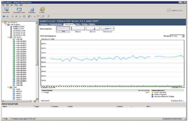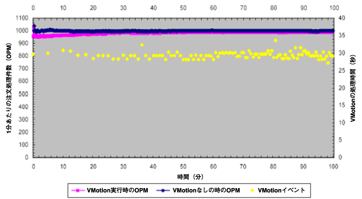 表5:テスト結果 2回目のテスト結果は、図3のピンクのグラフで示しています。最初のうちはごくわずかな低下が見られましたが(967OPM)、じきに処理数が上がり、VMotionを実行しないときの性能(985OPM)に肉薄しています。 その後、移動VM数が増えても同レベルを保ち、20回のVMotionイベントを発生させる最後の10分間が終わるまで性能を維持することができました。さらに、VMotionイベントの処理時間(黄色いひし形)を見ると、VMotionイベントの発生頻度が増えても、処理時間はほとんど変らないことがわかります。 図4には、ESX ServerのCPU利用率を示しました。VMotionの負荷が増えるに従い利用率も若干増え、約65%に到達しています。VMotionイベントの発生タイミングは、緑色の三角を見るとわかります。 |