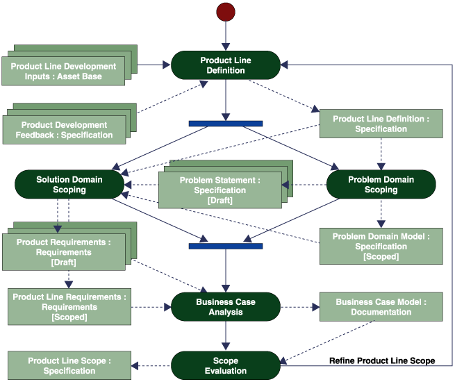 プロダクトライン分析は、これから構築するプロダクトラインによりどのようなプロダクトを開発するのかについて規定することを目的とした作業である。分析段階では、プロダクトラインが扱うドメインのスコープを定義して、問題領域と解決領域それぞれに対するモデリングを行う。