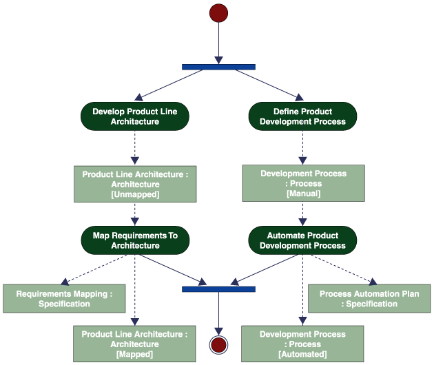 プロダクトライン設計は、対象とするドメインにおけるプロダクトの開発環境の整備を目的とした作業である。つまり個々のプロダクト開発時点でモデル駆動かつ部品の組み立てによる開発を可能とするための準備を行うのだ。 設計段階ではまず分析段階で特定したドメインモデルに最適なアーキテクチャの構築をはじめる。ここでいうアーキテクチャの構成要素とはコンポーネントの種類/役割/パターン/コントラクト/実装技術などのアプリケーションアーキテクチャおよびQoS(Quality of Service)戦略、論理サーバ構成などのインフラストラクチャアーキテクチャを指す。 さらに特定ソフトウェア資産開発のためのプロセス(マイクロプロセス)の定義も行い、実際にプロダクトを構築する際に可変的な資産をカスタマイズする方法まで含めて規定することになる。そしてプロセスを自動化するためのモデル環境とツール利用方法もあわせて規定していく。 次に分析段階でFeatureとして規定された要求とアーキテクチャとのマッピング作業を行う。その過程で可変性を扱うための戦略を規定するわけである。 |