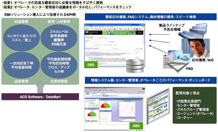 EMIソリューションでは、従来のFAQシステムやCMS(コンタクトセンターマネジメントシステム)のデータの物理的な統合やアプリケーションの組みなおしの必要はない。すでに存在し埋もれているデータ群を掘り起こし可視化を行うことで、さらなる販売機会の創出や顧客満足度の向上を目指すことを目的にしている。