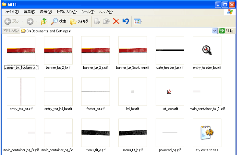 利用したいデザインテンプレートが決まったら、いよいよデザインテンプレートの設置を行います。今回はDr.Blogの「011 Pulp」を設置します。 ![]() 図2:テンプレートイメージ デザインテンプレートの設置方法は、各テンプレートによって若干異なる場合がありますので、注意してください。 まず最初に、デザインテンプレートファイルをダウンロードします。ダウンロードしたファイルは一般的にLHAやZIPなどで圧縮されていますので、任意の場所に展開してください。展開すると、以下のファイルが表示されます。 続いて、以下のページの下部にある、Dr.BlogベーステンプレートをMovable Typeのデフォルトテンプレートと置き換えます。 置き換える対象は、以下の11種類です。