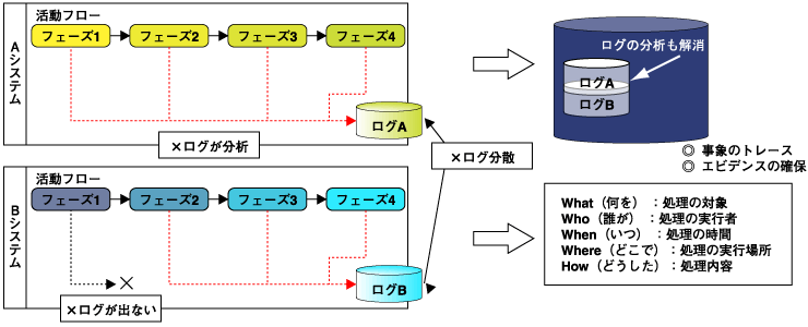 VPN検疫のポイントとして不正アクセスと同様に正規のアクセス権を持つ利用者の監視が重要と述べたが、正式な権限を持つ利用者であってもその権限の中で行う作業からの不正行為をトレースできることで、監査の強制化がはかれる。また情報漏洩などの事後対応としても有用であるため注目されている。 ![]() 図4:事後対応 日本版SOX法を含め、今後の様々なコンプライアンス要求に順応していくためには、企業内で行う活動の中に「不正」や「不備」が紛れ込まないように事前にIT技術を利用して対応を行う必要がある。 そこでは、さらに「不正」が紛れ込んでいないかどうかの定常的な監視として、事後対応および有益なログ(エビデンス)の確保というものが必要条件となるだろう。 現状を考えた場合、事前対応や事中の対応が主に検討され、事後対応が軽んじられる傾向にある。そのため、各企業とも本格的な対応という点では未成熟であり、抑止効果や行き届いたデジタルフォレンジックはこれからの課題かもしれない。 上の図5では、あるAとBというシステムにおける業務の例で、それぞれで処理を行うフローが存在している。この例では、システムAからシステムBへデータが転送され、Bシステムの途中から業務フローが開始される、といった構成となっている。なお、AとB、それぞれにログを取得できる機能は有している。 例えばシステムAからシステムBへフローが流れる場合、システムAのログはログAに格納され、システムBのログはログBに格納される。システムAからシステムBへフローが移った場合にも、その遷移した記録はログAおよびログBにそれぞれ格納される。 しかしこのシステムの問題点は、一連の4W1Hを事後にトレースすることが難しいことだ。これをカイゼンするためには「各システムを統合しA+Bのシステムへ作り変える」もしくは「システムAのログとシステムBのログを一元管理する」というカイゼンを加えることになる。図5では、後者の一元管理によるカイゼンを行っている。 このように業務活動の一連プロセスが正しく容易にトレースでき、最適化されるレベルを目指すとともに、事後対応として利用できるログというものを意識していく必要がある。 |