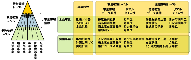リアルタイムな経営管理とは、迅速かつ適確な意思決定の支援をするために、随時にPDCAサイクルを回すことができることを指す。そのためには、まず、標準化/簡素化を徹底し、様々な管理を行うための実績情報をタイムリーかつ正確に収集できる「計数管理情報」を体系化・構築し、各事業の実態を随時把握できる環境を整備する必要がある。 迅速/的確な意思決定を支援する経営情報の管理を行うためには、各管理指標に関して管理目的に応じた管理対象、管理主体などを明確にすることが重要なポイントとなる。 様々な事業情報をそれぞれ適切に支援するために、マネジメントが持つ事業管理指標およびオペレーションレベルで持つ業務管理指標に対して、それぞれの事業特性を反映させる必要がある。 図5のように、事業特性として各事業領域を整理し、事業特性を把握し、管理レベルとして各事業特性に応じた事業管理要件およびリアルタイム性の定義を実施する必要がある。 |