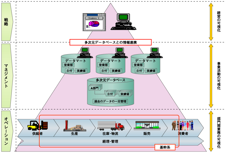 表4:BIの適用業種 このBIを実現するシステム構成は図6のようになる。 図6のシステムにおいて、社内のデータ資産を統合して管理するためのデータ管理機構である多次元データベースの構築は必須となる。その多次元データベースからそれぞれの部門が利用するデータマート構築することで、作業進行がスムーズになる。 これらの「見える仕組み」により、経営層に必要な情報を集約でき、迅速な意思決定につなげることができるのである。 |