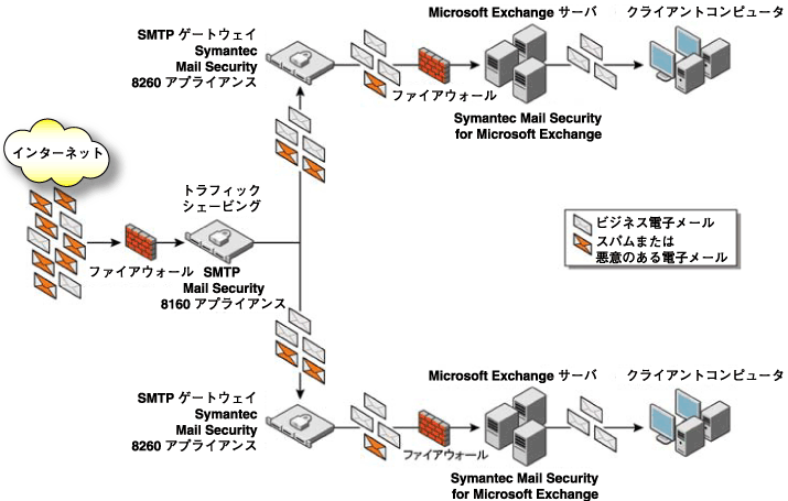 一般的な設定では、それぞれのExchangeサーバーにSymantec Mail Security for Microsoft Exchangeをインストールして、インバウンドとアウトバウンドのすべての電子メールをスキャンします。 Mail Security for Exchangeは、メッセージのヘッダー、本文、添付ファイルを含む、電子メールのすべてのコンテンツをスキャンします。Mail Security for Exchangeは、パブリックフォルダと個人の電子メールボックスに送信されたすべての電子メールをスキャンします。 統合電子メールセキュリティソリューションであるMail Security for Exchangeは、サーバーレベルで電子メールメッセージをスキャンし、セキュリティを確保します。この統合機能によって、Exchangeの電子メールをセキュリティリスク、スパム、ウイルスから確実に保護します。 |