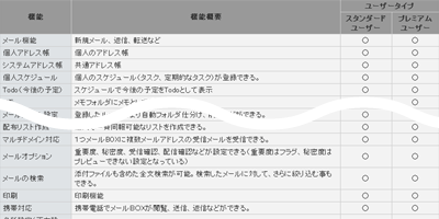Scalix Web Accessはユーザタイプによって利用できる機能が制限されています。スタンダードユーザ(無償)とプレミアムユーザ(有償)の2タイプで、それらの機能の違いは下表となります。 |