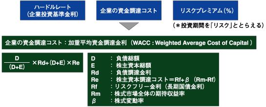NPV(Net Present Value)とは、将来発生するキャッシュフローをしかるべき利率で割り引いて算出した現在価値(PV:Present Value)から、投下投資額を差し引いたものである。 ![]() 図2:NPV算出例 企業における投資判断には通常、「ハードルレート」と呼ばれる基準金利を参考にする(図3)。 NPV算出の際には、以下のポイントに留意する。
