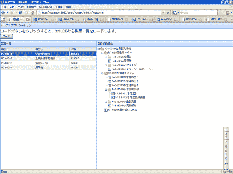 表4:取得したデータ表示の処理の流れ グリッドやツリーウィジェットはすでに用意されているので、XQueryの呼び出し部分の処理を記述することで、以下のような画面を素早く作成することができます。 詳細については実際のindex.htmlを参照していただくとして、ここではグリッド表示の部分とツリー作成部分について簡単に説明します。 |
