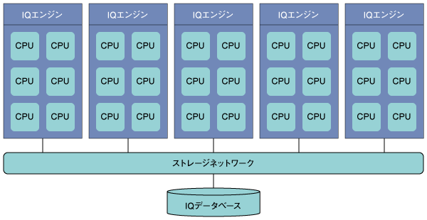 マルチプレックスは、いわゆるクラスター化の機能で、複数のコンピュータで稼動するIQエンジンから、共有されるIQデータベースへアクセスする構成を可能にします。 Sybase IQのマルチプレックスの特徴は、更新できるノードは1つに限定することによって、ノード間に発生するロック管理を簡素化にし、ノード増加に対する処理の落ち込みを最小限に抑えている、ということです。 1ノードで40同時ユーザからの参照があった場合、平均レスポンス時間は31秒です。これに対して、10倍の10ノード、400ユーザの場合の平均レスポンス時間は、31.6秒です。ノード増加による性能の劣化はわずか0.6秒(1.9%)に留まっていることから、ユーザ数増加という負荷増加に対して、IQマルチプレックスのノード増加は非常に投資効率の高いソリューションであることがわかります。 実際、Sybase IQのユーザ企業の中には、数10ノードのマルチプレックス構成で運用されているお客様も多くいらっしゃることからもユーザ数増加に対するSybase IQのスケーラビリティの高さがご理解いただけると思います。 |