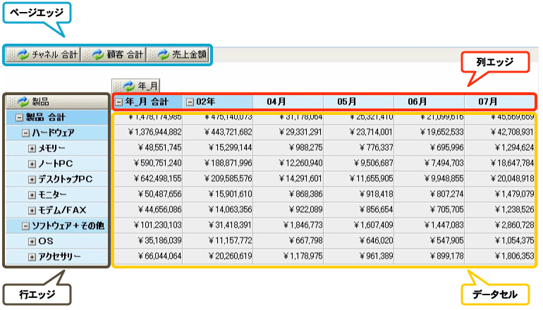 表の横軸が列エッジ、縦軸が行エッジと呼ばれます。横軸にも縦軸にも配置されない残りのディメンションとメジャーが最上段のページエッジに配置されます。行エッジと列エッジにかこまれた領域はデータセルと呼ばれ、集計された数値が表示されます。OLAP分析操作はこの画面をマウス操作によって実行します。