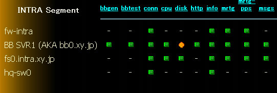 page、subpageコマンドの後ろに「title」タグを指定した場合は、サブページのコメントとして扱われ、リスト1のようにgroup(-compress)コマンドの後ろに指定した場合には、グループを2分割するような形で表示されます(図6)。 リスト1:bb-hosts抜粋 タイトルテキストにはhtmlタグを埋め込むことができるので、mrtgのリンクなどを配置しておくと便利です。 |