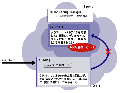 継承とコンストラクタに関する問題です。Parentクラスには、Stringデータを引数に取るコンストラクタを定義しています。Childクラスにはコンストラクタの定義はしていません。この場合、Childクラスにはデフォルトコンストラクタが定義されています。21行目でChildクラスの引数なしのコンストラクタを呼び出し、インスタンス化を行います。このとき呼ばれるのは、デフォルトコンストラクタです。 サブクラスのコンストラクタが呼び出されると、まずスーパークラスのコンストラクタが呼び出され、その後サブクラスのコンストラクタに定義した処理が実行されます。このとき、特に指定しなければ、スーパークラスの引数なしのコンストラクタが呼び出されます。 |