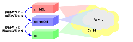 ParentクラスとChildクラスには継承関係があります。16行目でChildクラスのインスタンスを生成し、Child型のchildObj変数で参照しています。 次に19行目で、その参照をParent型のparentObj変数にコピーします。このときに、左辺と右辺のデータ型が異なりますが、左辺がスーパークラスの型、代入する値がサブクラスのオブジェクトの場合、型変換(キャスト)が行われます。サブクラスからスーパークラスへの型変換は暗黙的に行われます。 22行目では、Parent型にキャストされていたオブジェクトを、再度Child型に戻しています。スーパークラスからサブクラスへの型変換は、明示的に行います。キャスト演算子を用いて型変換を行います。 |