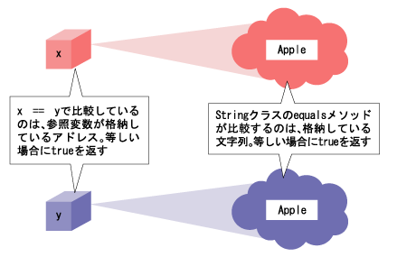 ==演算子は、参照変数の場合は、参照しているオブジェクトがまったく同一であるかどうかを比較します。同じ型であるか、オブジェクトに格納されているデータが同じであるか、同じアドレスに存在するか、などを比較しています。設問のプログラムの場合は、データ型、格納されているデータは同一ですが、それぞれ別々のアドレスに存在するオブジェクトであるため、==演算子を用いた場合は、falseが返されます。 Stringクラスのequalsメソッドは、同じオブジェクトであるか、同じオブジェクトではなくても、オブジェクトの型と、オブジェクトが格納している文字列が同一であるかを比較します。同じ型で、なおかつ格納している文字列が同一の場合、trueが返されます。設問のプログラムでは、同じ"Apple"という文字列を格納しているため、trueが返されます。 したがって、BとCが正解です。 |