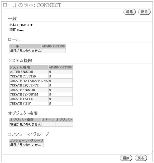 実行結果を以下の図に示します。 このようにロールのビューでは、CONNECTロールに付与されているロール名C、CONNECTロールに付与されているシステム権限名D、CONNECTロールに付与されているオブジェクト権限名E、およびCONNECTロールが割り当てられているリソースコンシューマグループが表示されます。したがって、C、D、Eが正解です。 |