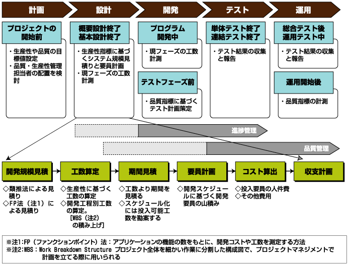 プロジェクトを定量的に管理する主たる目的は、計画策定時に設定した各種の目標値と、進行中のプロジェクトの実績値との差異を分析評価し、定量的な裏づけをもってタイムリーな課題管理やリスク管理を行い、それによって計画の実現性を高め、生産性や品質を向上させることである。 以下では、システムを構築するベンダー側がプロジェクトの各段階においてどのような定量的管理を行うかと、それと合わせてユーザ企業の側がベンダーから定量指標を用いた報告を受けることによって、プロジェクト進捗状況をどのように適切に判断すべきかについて説明する(図3)。 計画フェーズではユーザ企業においても、自社のIT統括部門などに集約されている全社共通の標準指標をもとに、プロジェクト開始前の目標設定として生産性や品質の目標値を明確にしておく。また兼任でもよいので、品質や生産性の管理担当者を配置することも検討しておく。 設計フェーズでは、次の手順を踏んで見積り作業が行われる。