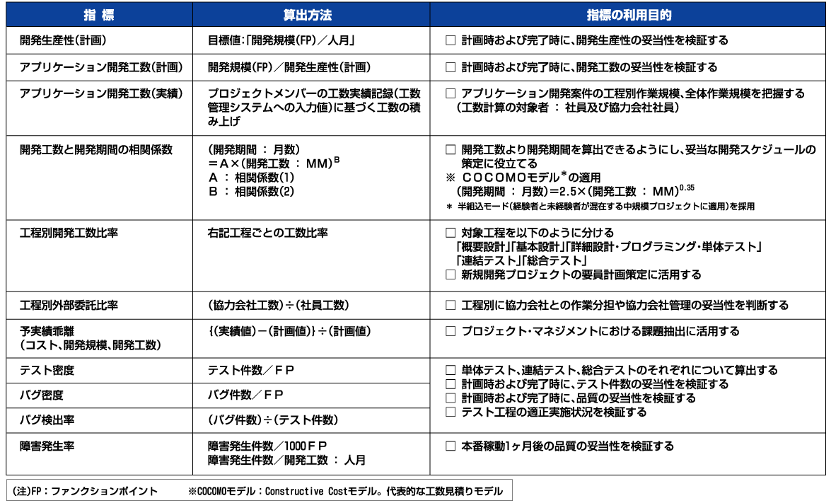 設計フェーズのなかでも、概要設計の段階では大枠の規模見積りを行うため、類推法や簡易FP(Function Point)法を適用して見積もることになる。この場合、外部設計や基本設計の終了時にあらためて詳細な見積りを行って実行計画を策定する必要がある。このため、当初の見積りの前提や根拠、見積り方法、見積り基準、見積り結果に対するリスクなどについては、見積り資料のドキュメントの中に明確に記載しておくことが望ましい。途中で見積り変更を行う上での根拠となるからである。 こうした見積りに関する情報蓄積は、ユーザ企業としてベンダーにシステム構築を依頼し見積りを出させる際に、委託者側としての見積りを実施し、ベンダーからの提案の妥当性を評価するための基礎資料として役立つ。 開発フェーズでは、投入工数の実績値やコストの大部分を占める投入要員の人件費を把握する。ユーザ企業としては、実際にはベンダーからの報告をもとに実績値を収集する。 テストフェーズではテスト件数やバグ件数などの実績値を収集し、品質管理目標値との差異分析をもとに品質評価を行い、必要に応じてベンダーに品質改善策の実施を指示する。自社で品質指標を持っていない場合は、外部コンサルタントなどが所有している品質基準と照らし合わせて、十分な品質に達しているかどうかを判定し、現工程の終了可否を判断することもある。 運用フェーズでは、事業部門の業務に重大な支障を与えた障害から、利用者には直接影響しないが保守・運用部門の作業を必要とした障害まで含めて、障害件数の推移や発生原因および解決に要した工数・コストを把握し、品質向上活動に活用する必要がある。 指標の精度を向上させるためにはプロジェクト内での実績値の収集だけでなく、プロジェクトアセスメント組織による見積りの客観的評価、全社IT統括部門での各プロジェクトからの予実績値の集約・蓄積、管理すべき指標や標準値の定期的な見直しなど、PDCAサイクルを回し続けることが重要となる。 表2に、システム開発における主な管理指標の例を掲載しておく。これらは、企業にシステムを提供する情報サービス企業で活用されている管理指標であるが、ユーザ企業においても、システム構築プロジェクトの各段階における管理指標として参考になる。 |