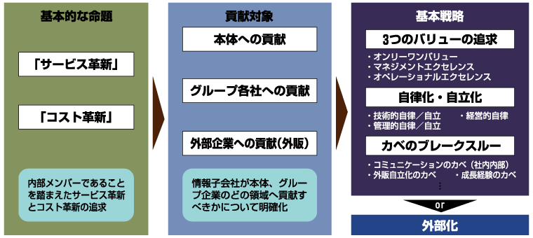 情報子会社の基本命題として、「サービス」と「コスト」両面からの革新が求められる。まず「サービス」の側面では、グループ企業の内部をよく知る者として、深い顧客理解に基づくサービス提供力の向上とそれによるユーザ満足度向上、さらには、戦略推進・効率化推進へのより高いレベルでの関与が求められる。 また、内部に人的ネットワークを持ち、風土・文化をよく知る者として、密度の高いコミュニケーションに基づく、きめ細かなサービス提供が求められる。さらに、プロジェクトの構想時点から関与することによる全体工期の短縮や本体・グループ各社からの要請への柔軟な対応も求められている。これらの要請に応えるため、常に提供サービスを見直し、品質向上をはかっていかなくてはならない。 「コスト」の側面では、特に開発・運用などの工程を中心として、「同じ品質・納期なら外部委託よりも安く」といったコストパフォーマンスの改善に加えて、外部委託比率を下げることや、グループ企業に対するサービス提供範囲の拡大による、グループ外への資金流出の抑制が求められる。 情報子会社の基本戦略上、その基本命題の次に問題となるのがその貢献対象についてである。情報子会社は表5にあるように3つの軸足を持ちながら、貢献対象を考えていく必要がある。