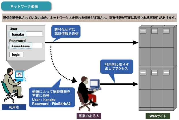 Webサイトと利用者の間で交わされる情報は、ネットワークの盗聴によって不正に取得される可能性があります。通信や情報が暗号化されていない場合、盗聴によって取得された情報が悪用され、成りすましなどにつながる可能性があります。