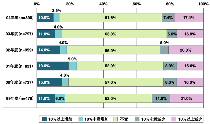 一方、IT部門の要員数を見ると、2001年度以降、一貫して減少傾向にある。前のページの図2の、本社IT部門が戦略と企画に特化している集権型B、C及び連邦型Bタイプの企業では、本社IT部門のスタッフ数は、極端な場合は数人から10人前後という場合が多い。本社IT部門のミッションを徹底的に絞り込んで、ぎりぎりまでスリム化している。 こうした企業では、一応は戦略と企画を担当するといっているが、実際には戦略立案までで、企画から開発、運用とすべて子会社などにアウトソースしている場合が少なくない。 |