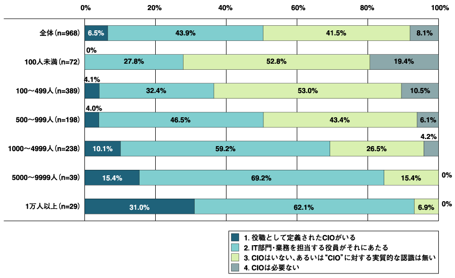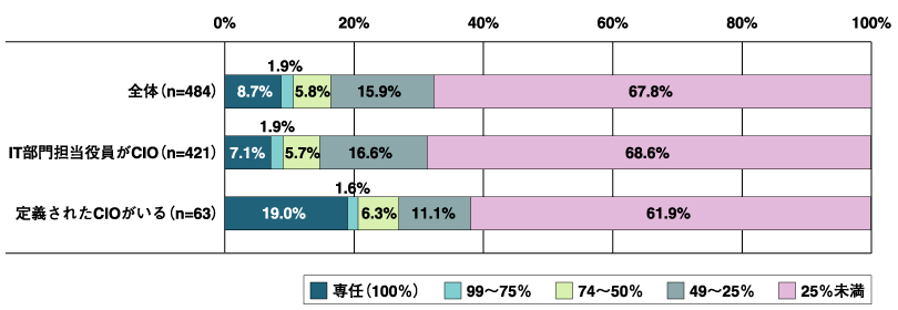 「CIO(最高情報責任者)」という言葉はすっかり定着しているが、実際に企業ではどのように認識されているのか。 まず、CIOの任命状況について調査したところ、「役職として定義されたCIOがいる」企業が6.5%、「IT部門・業務を担当する役員がそれにあたる」企業が43.9%で、CIOが認識されている企業が半数という結果となった。また、企業規模が大きいほどCIOがいる割合が高くなっている(図4)。 つい数年前までは、我が国の企業には、会社から正式に任命され、自らもそう名乗っているようなCIOはほんの数えるほどしかいないといわれていた。しかし、上記のアンケート結果およびインタビューから、かなりの割合でCIOに相当する人物がいることが明らかとなった。 インタビュー先企業においては、正式にはCIOという名前を使っていないが、社内でCIOとして認知されている人がいるという企業は多く、むしろそのような人間はいないという企業は少数派であった。 しかしながら、公式あるいは非公式のCIOの多くは、何らかの担当役員が兼任しているという場合が多く、CIOとしてIT関連の仕事に費やす時間やエネルギーは、その人の仕事の内およそ1割程度だろうというケースが多く、専任のCIOはまだ少ない。 アンケートにおいても、専任のCIOは少なく、IT関連業務に投入する時間は、25%未満という企業が多数派という結果となった(図5)。 |