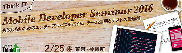 | イベント名 | Think IT Mobile Developer Seminar 2016 失敗しないためのエンタープライズモバイル。チーム運用とテストの最適解 |