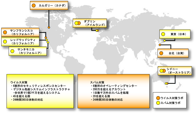 シマンテックの製品やサービスは、シマンテックグローバルインテリジェンスネットワークのセキュリティ研究組織でサポートされています。この組織は、セキュリティ脅威に関するセキュリティ通知を世界中で収集、分析、配信しています。1億5,000万を超えるウイルス対策デスクトップ、20,000の侵入検知ソフトウェア(IDS)クライアント、180を超す国々で稼働するファイアウォールセンサー、43,000を超える管理対象セキュリティ装置から、悪質なコードデータを収集しています。