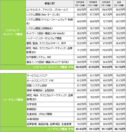 TOP>キャリアアップ> 第10回:業種明暗も!2006年冬のエンジニアボーナス平均80万円 IT転職百科事典 第10回:業種明暗も!2006年冬のエンジニアボーナス平均80万円 編者:Tech総研 2007/1/10 次のページ 日経連が12月13日に発表した2006年冬のボーナスは、交渉妥結額(加重平均)が88万4712円と昨冬に比べ、2.48%増え、2年連続で最高額を更新した。伸び率も4年連続でプラスになっている。日経連調査の場合は、大手企業が中心のため、調査対象者が属する企業規模にばらつきのあるTech総研の調査とは毎年金額がずれるのが特徴だ。ただ、業種をIT・通信、メーカーに絞り、かつ職種を技術職に限定しているため、日本のエンジニアの平均像をみるにはより適したデータともいえる。 今回の調査は1000人のエンジニアが対象。その冬のボーナスの全体平均が80万円となった。昨年の調査は66.6万円だった(ちなみに同時期の日経新聞調べは約80万円)から、大幅な増額とはいえるが、調査サンプルが異なるため、昨年比は厳密なものではない。いずれにしても、今回は日経連調査など企業を対象とした調査結果に近い数字になった。 年代別では、20代前半が49万円、同後半が59万円、30代前半が71万円、同後半が88万円、40代前半が101万円となっている。職種別で最も高いのが「研究、特許、テクニカルマーケティング、品質管理」の104万円。毎年高ランクにつける「コンサルタント、アナリスト、プリセールス」職種も99万円と健闘している。最も低いところで「運用、監視、テクニカルサポート、保守」の65万円だった。(DATA1) 全体には「ソフトウェア・ネットワーク関連」職種が75万円であるのに対して、「ハード ウェア関連」職種が86万円と、ハード優位、“硬高・柔低”の傾向は、昨年と変わらない。 ただし日本の賃金構造では、職種別の差異以上に、業種や企業規模の違いのほうが、ボーナス額に実態的な影響を与える。そこで会社業種別平均をみると「IT・通信系」が69万円であるのに対して、「電気・電子・機械系」のメーカーが85万円、「素材・医薬品系」が95万円という有意な明暗差がみられた。 この間の景気回復を牽引してきたのが、エレクトロニクス企業であることから、その85万円という数字は当然の感もあるが、IT企業がふるわないことには、時代の変化を感じる。反対に、素材系つまり化学メーカーや医薬品会社の好調ぶりもうかがえる結果となった。こうした事情は、エレクトロニクス、メカトロ企業の求人が活発で、また化学・素材メーカーでも人材が引く手あまたといった、エンジニアの転職マーケットにも反映されている。 DATA 1 職種・会社業種別・2006年冬のボーナス平均額を大公開! ○職種別平均ボーナス額 (画像をクリックすると別ウィンドウに拡大図を表示します) ○会社の業種別平均ボーナス額 (画像をクリックすると別ウィンドウに拡大図を表示します) ○最も影響があったと思われる評価基準 では実際に満足度はどれくらいなのか。具体的な数値や、実際の使い道など、アンケート結果を元に解析していこう。続きはこちら>> 次のページ IT転職百科事典 第1回 都心vs地方の最大格差は2割! 地域別年収差を徹底比較 第2回 もしも平賀源内が35歳でレジュメを書いたら 第3回 KDDIテクノロジー斉藤社長が欲しい「究極のレジュメ」 第4回 一般人理解不能…ここまでズレてる「エンジニア時間」 第5回 大手ITベンダー“在宅勤務”一斉導入の真意 第6回 IT業界の給与格差を探る!元請と下請でいくら違う? 第7回 仕事の“やり損”を回避せよ!世渡り上手な自己PR術 第8回 外国人のホンネ「ソコがヘンだよ!日本人エンジニア」 第10回 業種明暗も!2006年冬のエンジニアボーナス平均80万円 第11回 梅田望夫氏が提案“2007年ITエンジニア進化論” 第12回 年収250万円未満で働く30代エンジニアの胸の内 第13回 人事が証言!大手が若手IT技術者を欲しがる理由 第14回 転職で年収アップを狙え!大作戦/レジュメ・面接編 第15回 世界に知られるオープンソース言語「Ruby」を作った、まつもとゆきひろ 第16回 次世代Webサービスの本命、SNSの展望 第17回 男性の皆さんわかってよ!女性SEの仕事へのキモチ 第18回 バブル時代が懐かしい?エンジニア福利厚生の実情 第19回 IT企業の悪しき慣習を破る!技術屋社長の社内制度 第20回 「あるある」「ねーよ!」巷のエンジニア都市伝説 第21回 登大遊@PacketiXは好奇心の振幅が非常に広い 第22回 職種別 採用天気予報 [07年4〜6月期] 第23回 2万人の年収比較!IT系職種は本当に給料が安い? 第24回 我ら“クレイジー☆エンジニア”主義!世界初!量子テレポーテーションを成功させた古澤明 第25回 IT系300人に質問☆○○だと思う企業ランキング 第26回 ”ヒーローエンジニア”を探せ!大ヒットmeromero parkのFLASHエンジニア 第27回 新人は知らない…先輩エンジニアの黒い教育活動記 第28回 本当にあった!ITエンジニア垂涎の極上オフィス環境 第29回 外資系だけじゃない!海外と関わるIT技術者の仕事 第30回 俺もお前もアイツも危ない“メタボリック